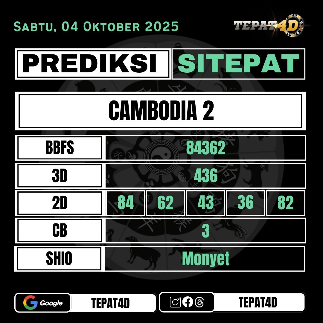 Data Keluaran dan Paito Warna Cambodia merupakan kumpulan result yang diambil dari website resmi www.officialcambodiapools.net dengan tujuan untuk mempermudah master-master dalam meracik rumusan angka di pasaran Cambodia 2. Result Pasaran Cambodia 2 setiap hari di jam 14:50 WIB