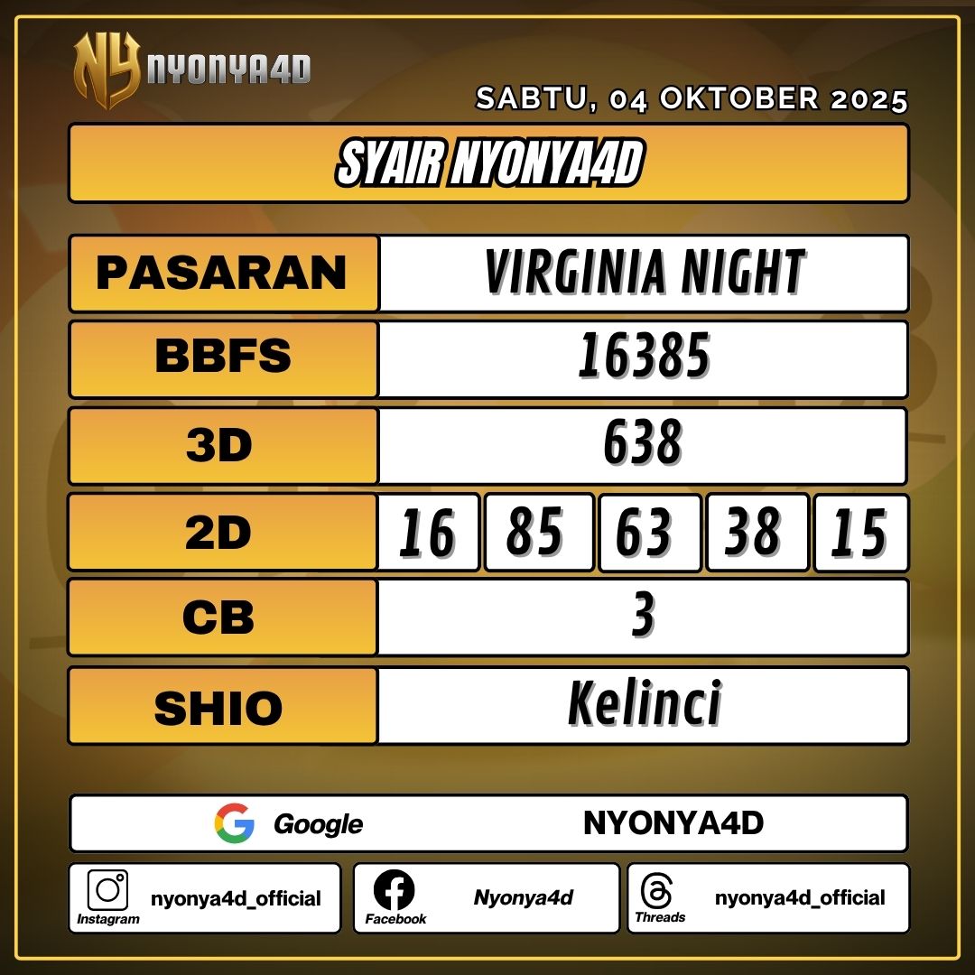Data Keluaran dan Paito Warna Virginia merupakan kumpulan result yang diambil dari website resmi https://www.usatoday.com/lottery/us-va dengan tujuan untuk mempermudah master-master dalam meracik rumusan angka di pasaran Virginia Night. Result Pasaran Virginia Night setiap hari di jam 10:00 WIB